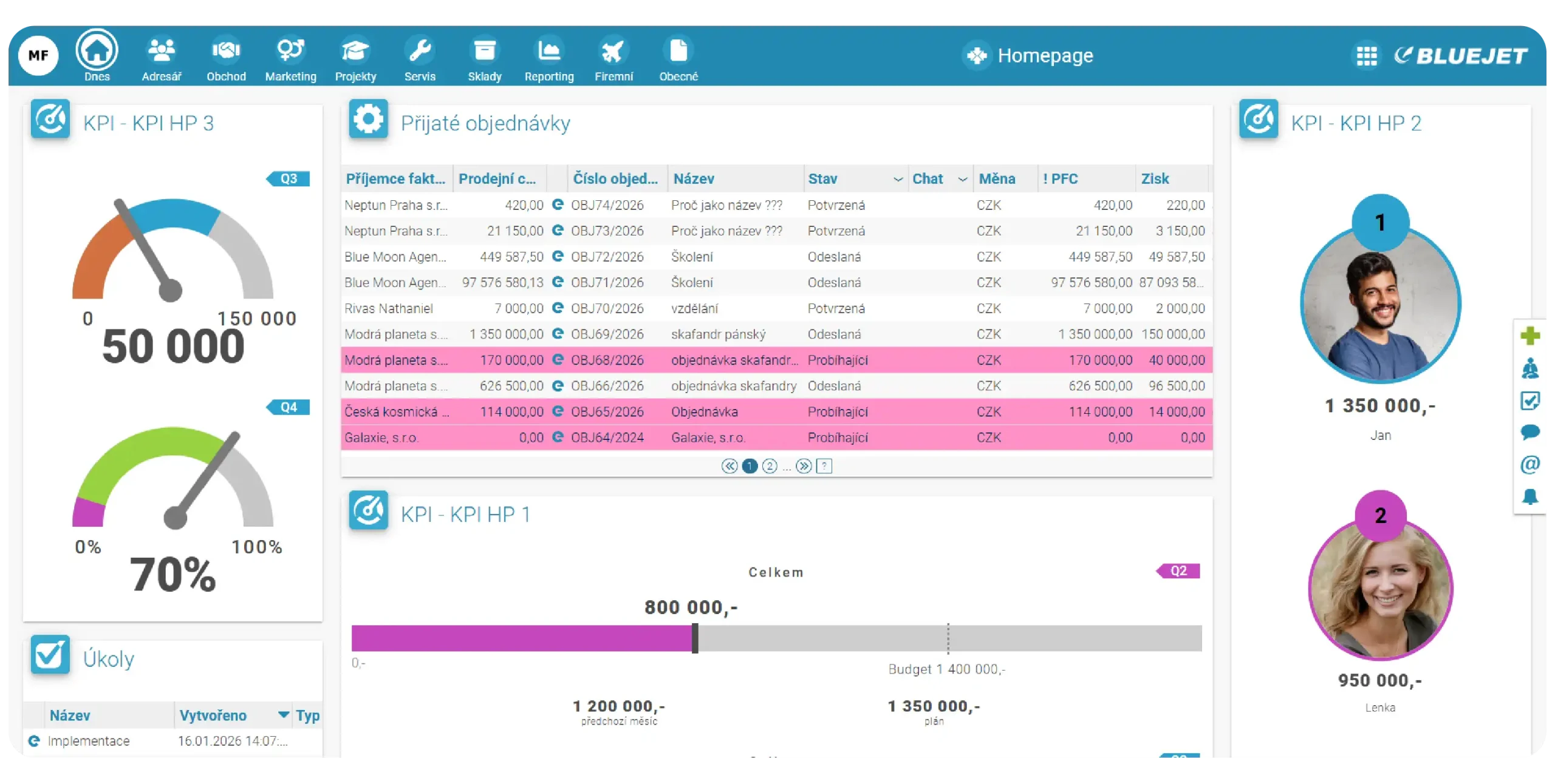 BLUEJET je flexibilní obchodní a projektová platforma pro jedince i firmy, která umožní mít celý byznys pod kontrolou – od prvního kontaktu, přes marketing až po fakturaci a vyhodnocení výkonu.